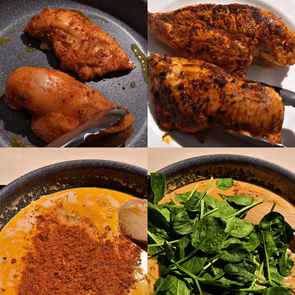 - Step 2 — Sear the chicken: Preheat oven to 180°C (356°F). Rub chicken breasts with olive oil and coat generously with Cajun seasoning on both sides. Heat a skillet over medium-high heat. Sear chicken 2–3 minutes per side until a golden crust forms.
